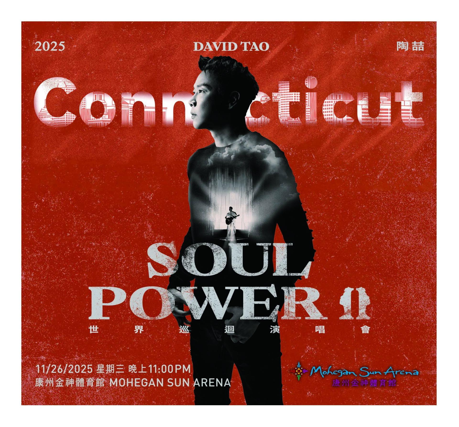 華語靈魂音樂之父陶喆(David Tao)即將於 2025 年 11 月 26 日(星期三,感恩節前夕)晚 9 時,登陸康州金神體育館(Mohegan Sun Arena),帶來萬眾期待的《Soul Power II 世界巡迴演唱會》康州站。這場橫跨多城、好評如潮的巡演,將以全新升級的舞台與編制,為北美樂迷呈現一場年度最具靈魂的音樂盛宴。
