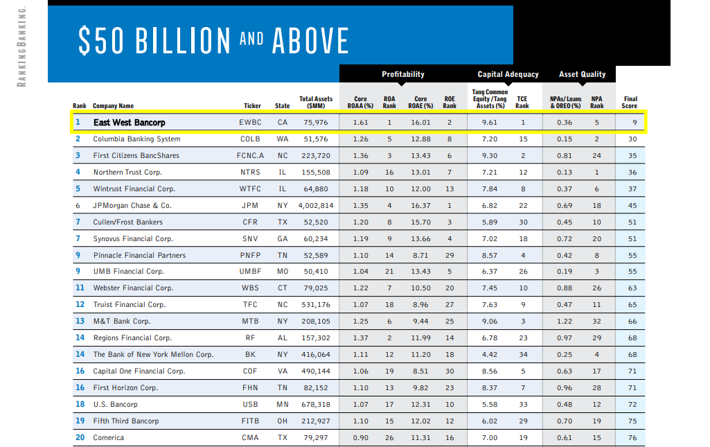 根據評比結果,華美銀行集團憑藉在資產報酬率(ROA)、股東權益報酬率(ROE)、有形普通股權益比率(TCE)、以及不良資產比率四大核心指標上的優異表現,綜合排名第一。 同時,公司還被評為資本實力最雄厚的銀行,在所有資產規模超過 500 億美元的銀行中擁有最高水準的有形資本。 本次排名所依據的數據截至 2024 年 12 月 31 日,更多研究結果請點擊此處查看。