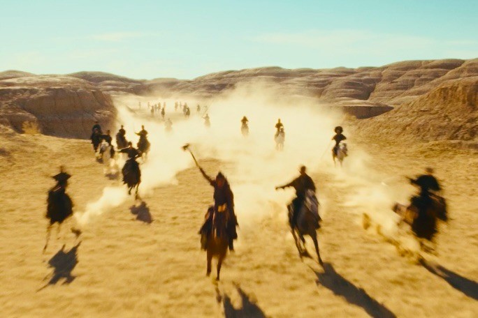 影片約 70% 場景採用實景拍攝,劇組遠赴新疆魔鬼城、敦煌等地,在高達 55℃ 的酷熱與沙塵暴環境下完成拍攝。《鏢人》所呈現的 “大漠美學”,並非單純的視覺奇觀,而是將沙粒流動的軌跡與人體動作的力學之美結合,形成一種原始、粗糲卻極具力量感的武俠影像風格。
