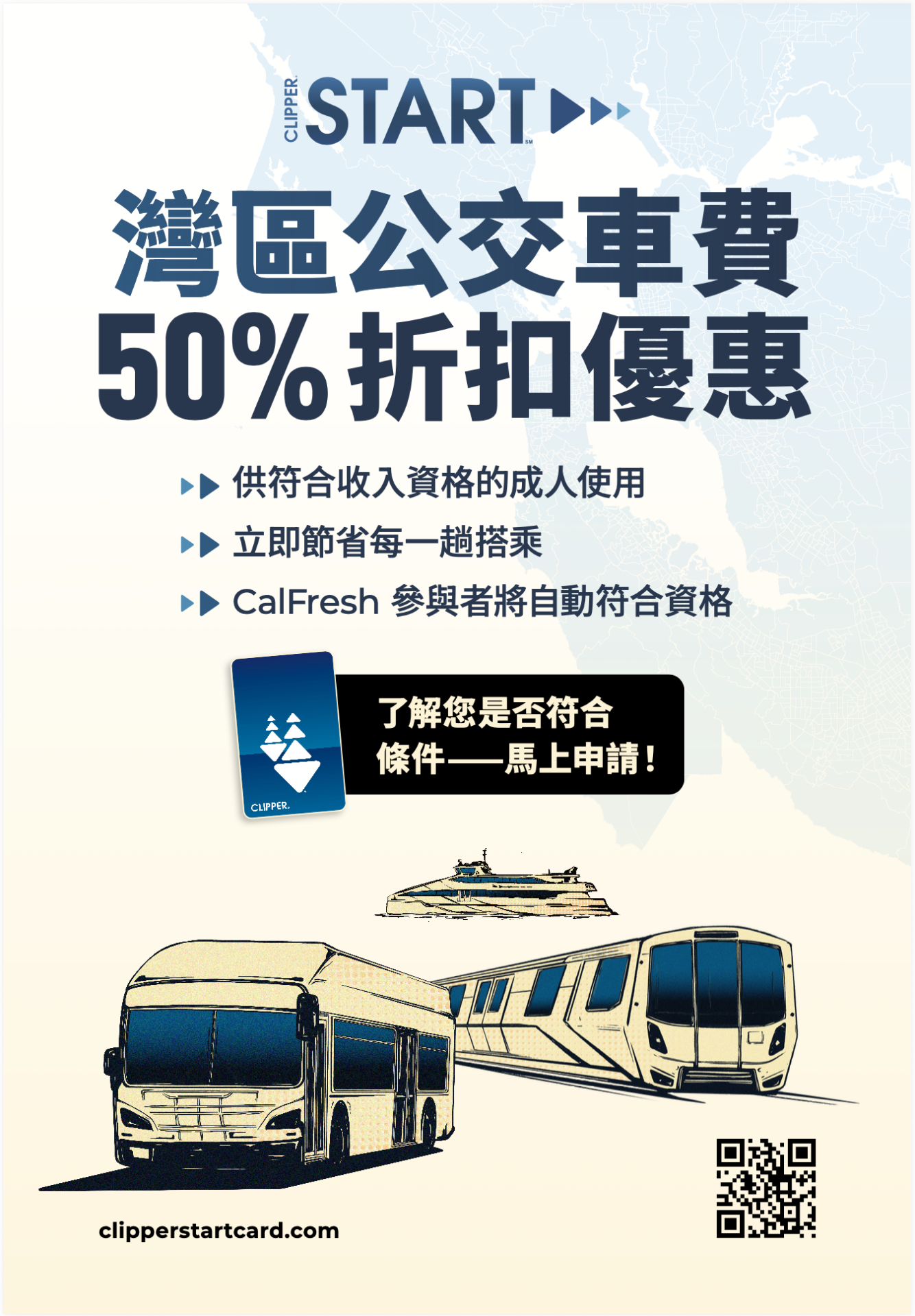 Clipper START 是一項折扣計劃,讓灣區公共交通變得更經濟實惠,並適用於所有交通機構!年齡在 19 至 64 歲之間,且家庭收入符合標準的合資格灣區居民,可享巴士、 BART 、火車及渡輪票價的 50% 折扣。 CalFresh 和 Medi-Cal 計劃的參與者自動符合資格。